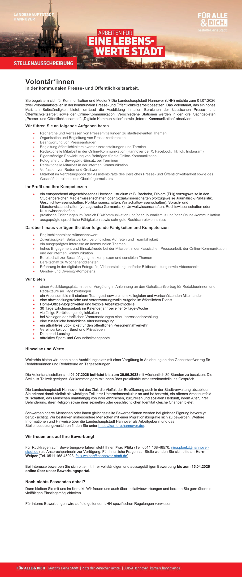 Für Rückfragen zum Bewerbungsverfahren steht Ihnen Frau Plötz (Tel. 0511 168-46570, nina.ploetz@hannover-stadt.de) als Ansprechpartnerin zur Verfügung. Für inhaltliche Fragen zur Stelle wenden Sie sich bitte an Herrn Weiper (Tel. 0511 168-45023, felix.weiper@hannover-stadt.de).