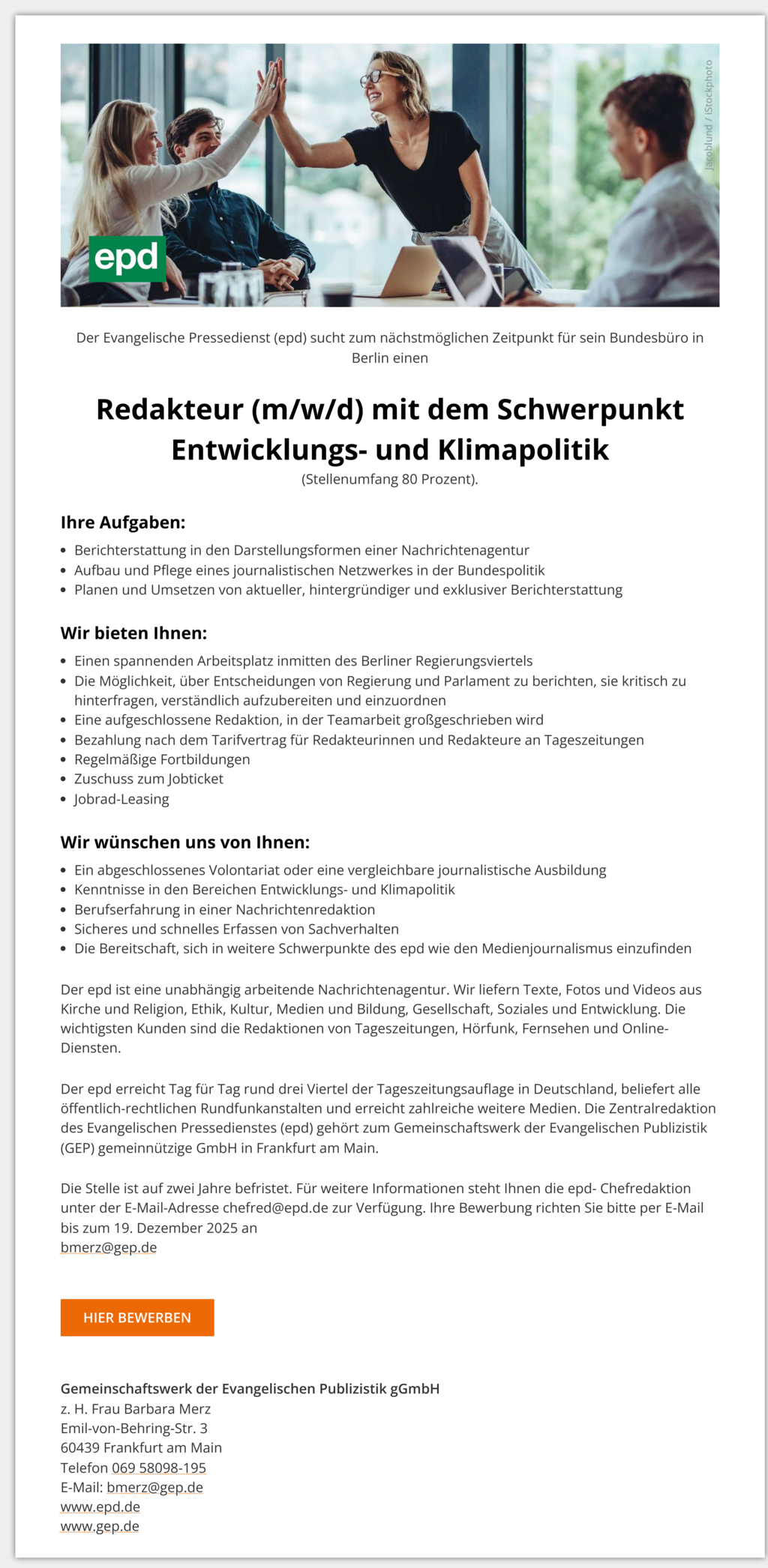 Die Stelle ist auf zwei Jahre befristet. Für weitere Informationen steht Ihnen die epd- Chefredaktion unter der E-Mail-Adresse chefred@epd.de zur Verfügung. Ihre Bewerbung richten Sie bitte per E-Mail bis zum 19. Dezember 2025 an