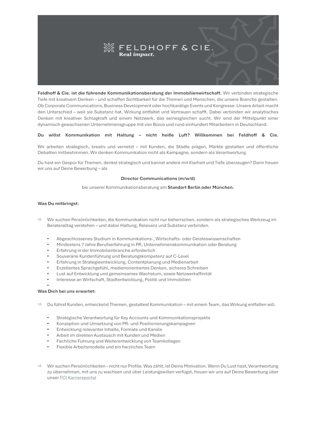 Feldhoff & Cie. ist die führende Kommunikationsberatung der Immobilienwirtschaft. Wir verbinden strategische Tiefe mit kreativem Denken – und schaffen Sichtbarkeit für die Themen und Menschen, die unsere Branche gestalten. Ob Corporate Communications, Business Development oder hochkarätige Events und Kongresse: Unsere Arbeit macht den Unterschied – weil sie Substanz hat, Wirkung entfaltet und Vertrauen schafft. Dabei verbinden wir analytisches Denken mit kreativer Schlagkraft und einem Netzwerk, das seinesgleichen sucht. Wir sind der Mittelpunkt einer dynamisch gewachsenen Unternehmensgruppe mit vier Büros und rund einhundert Mitarbeitern in Deutschland.