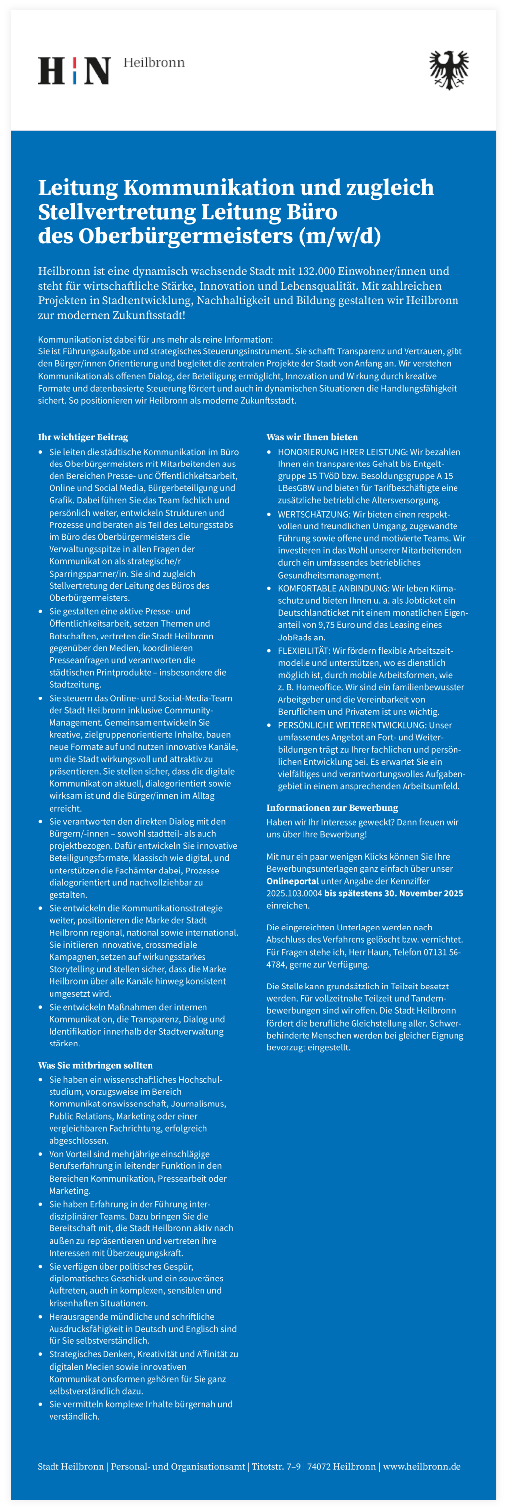 - Sie steuern das Online- und Social-Media-Team der Stadt Heilbronn inklusive Community-Management. Gemeinsam entwickeln Sie kreative, zielgruppenorientierte Inhalte, bauen neue Formate auf und nutzen innovative Kanäle, um die Stadt wirkungsvoll und attraktiv zu präsentieren. Sie stellen sicher, dass die digitale Kommunikation aktuell, dialogorientiert sowie wirksam ist und die Bürgerinnen und Bürger im Alltag erreicht.